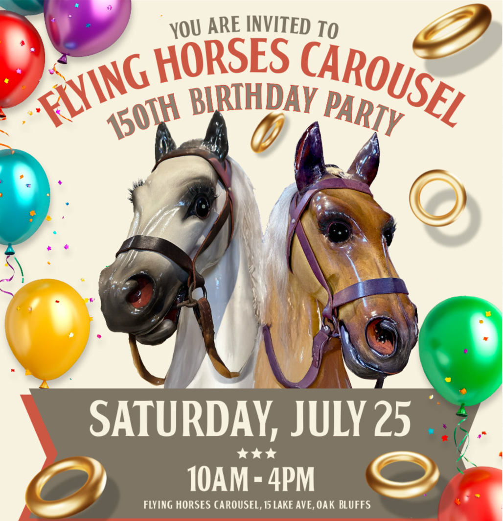 You are invited to the Flying Horses Carousel 150th Birthday Party! Round and round we go—150 years of magic in motion. Celebrate America’s oldest carousel with a joyful birthday adventure that begins at the Flying Horses and winds through Oak Bluffs with activities for the whole family!