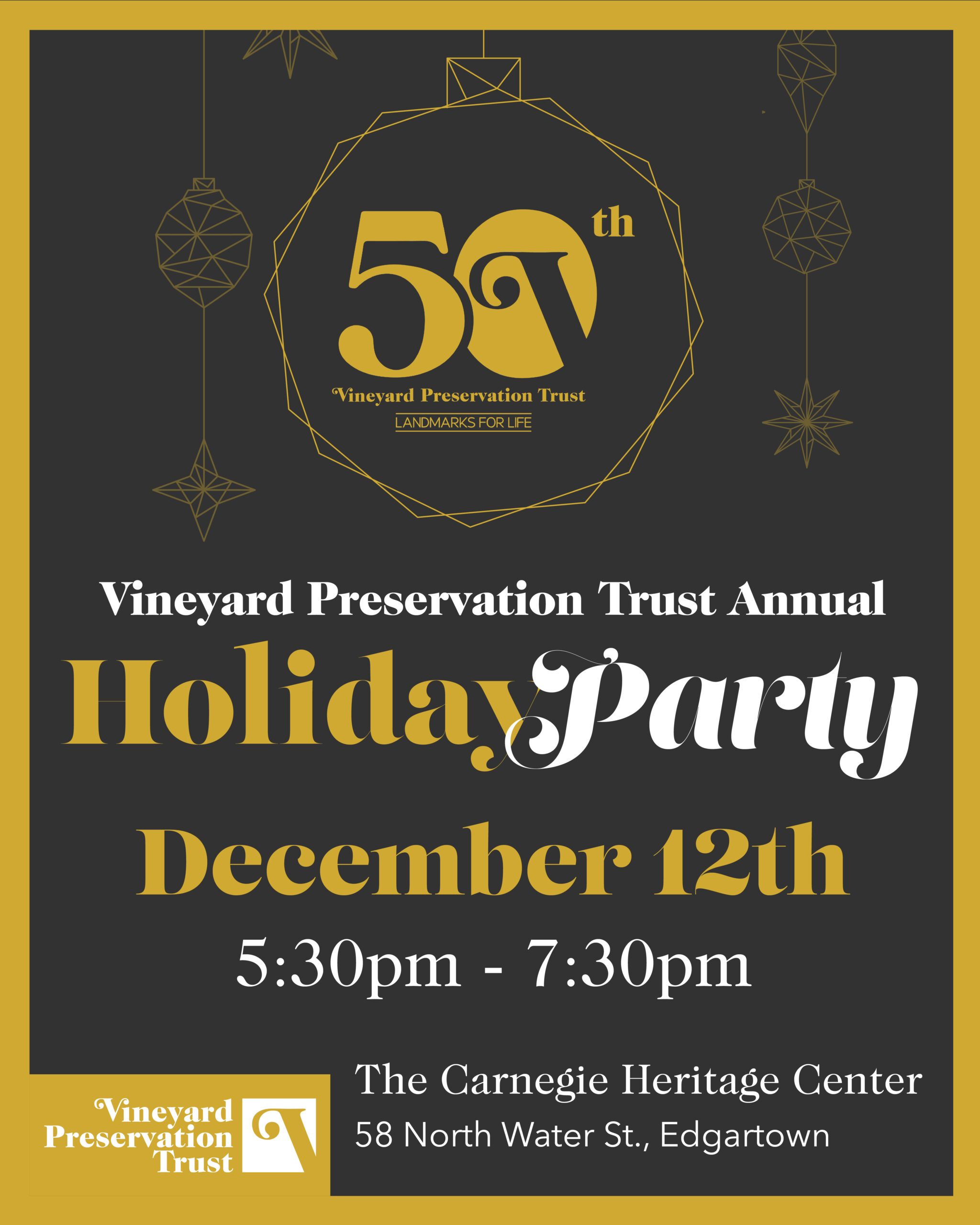 Celebrate the season at the beautifully decorated Carnegie Heritage Center! Enjoy festive cocktails, hors d’oeuvres, and holiday cheer amid historic charm. Gather with friends of Vineyard Preservation Trust to toast the holidays and support the care of our Island’s most iconic landmarks.
